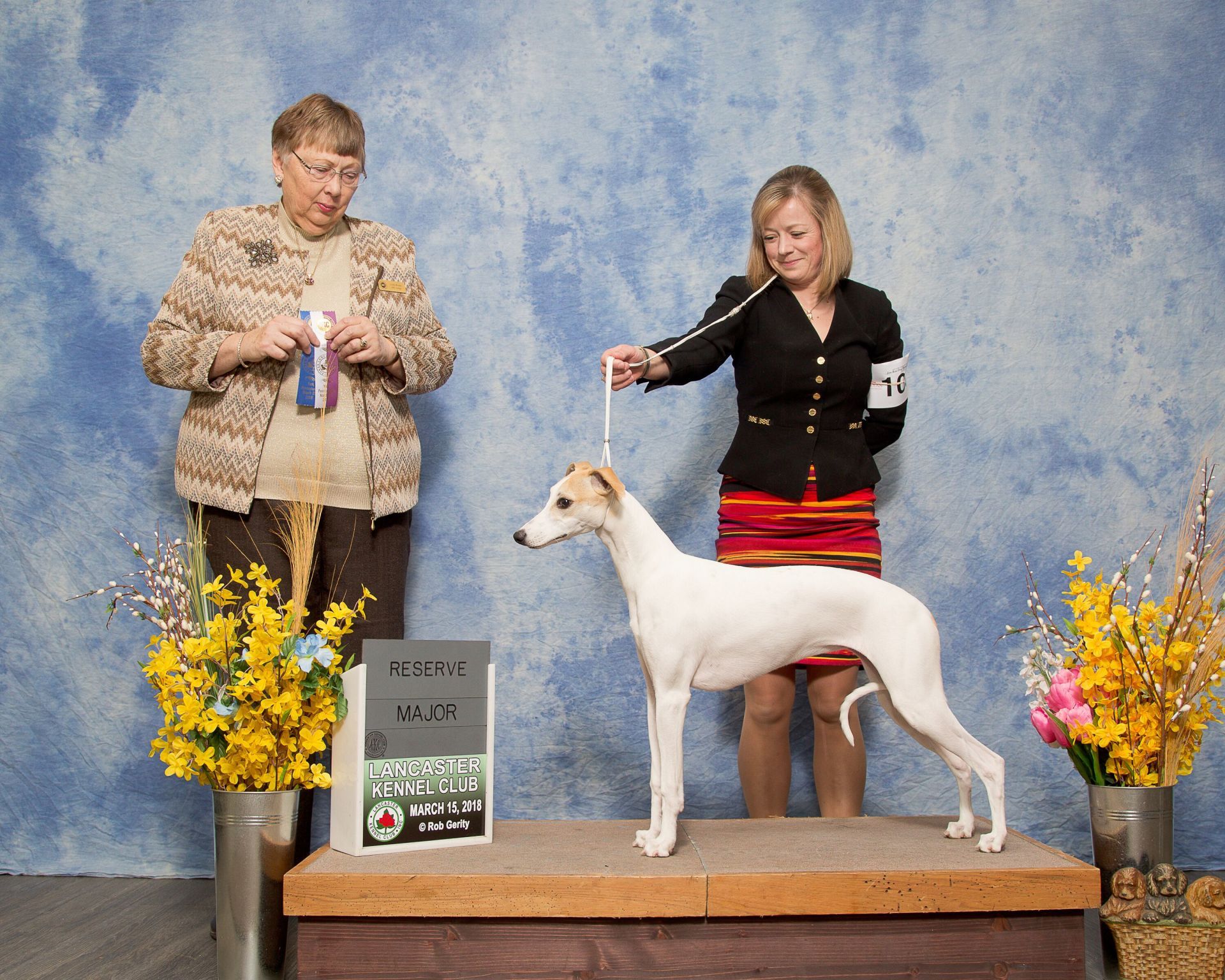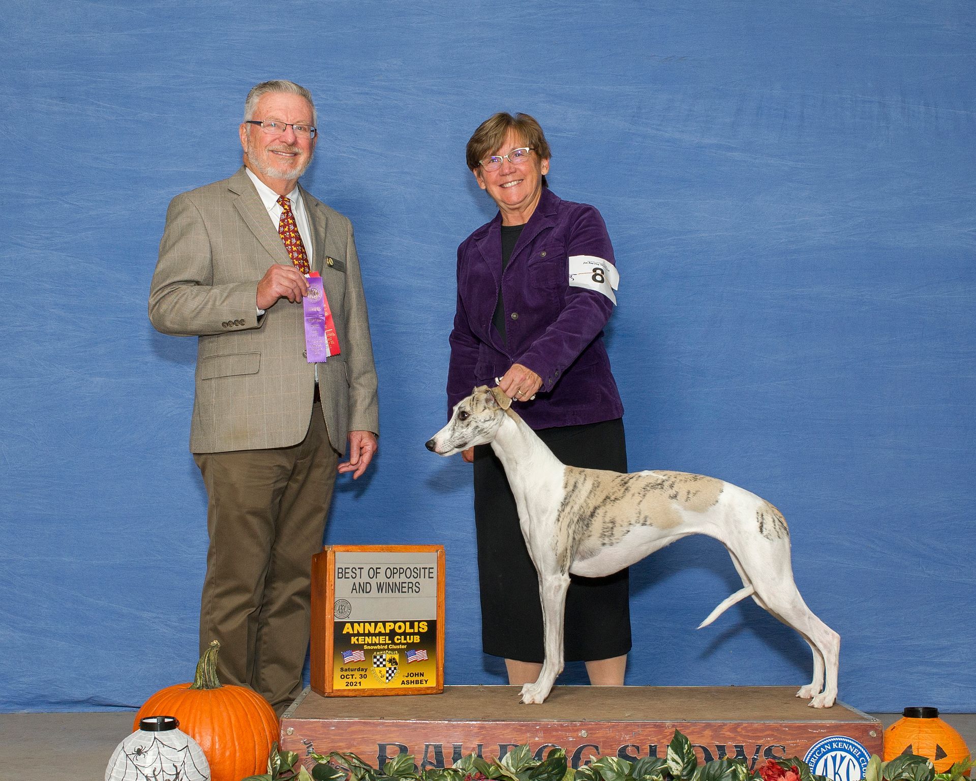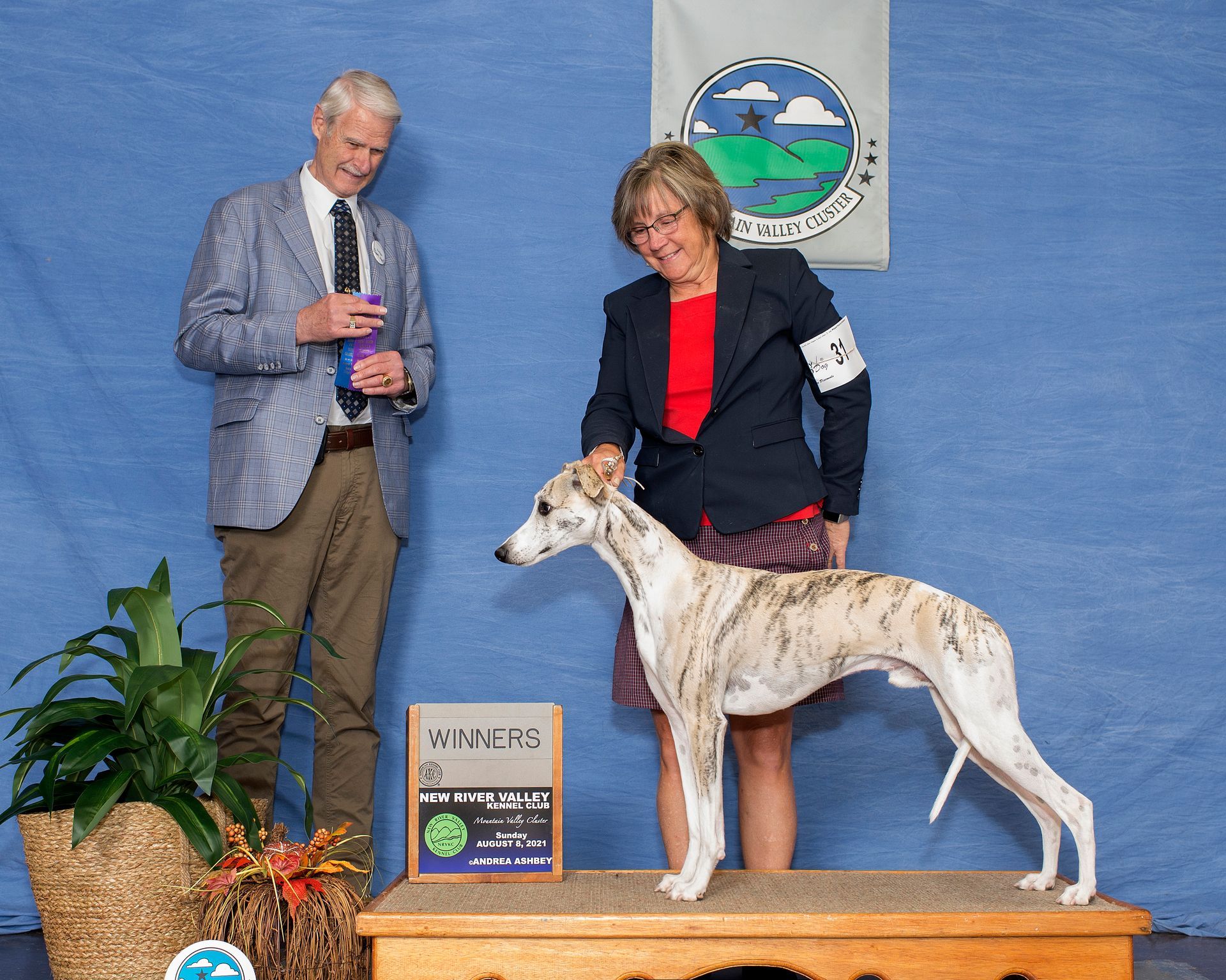 Elton is one of the two pups I kept from the Space Travel litter. He has turned out to be quite the runner, excelling at lure coursing and earning many BOBs and BIFs. He is an ASFA field champion, and has 2 majors and 14 points in AKC coursing. Only one more point to go!! With limited showing, he has one major and several points. Showing will resume this year.
